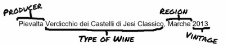 Type of Wine – A producer can give his or her wine its own unique name, but Italian wines are often named for a region, or a sub-region, which is classified according to certain production rules. Verdicchio dei Castelli di Jesi must contain a minimum of 85% Verdicchio with Trebbiano and Malvasia grapes rounding out the rest.