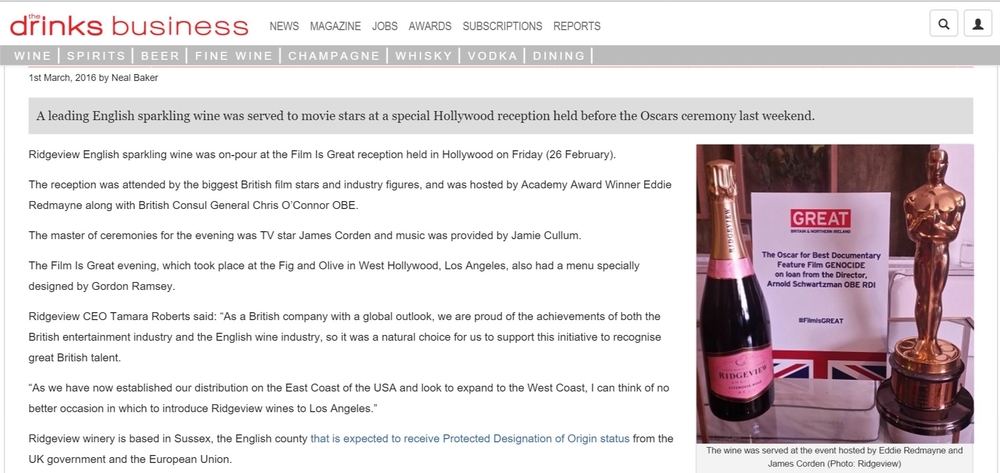 Ridgeview English sparkling wine was on-pour at the Film Is Great reception held in Hollywood on February 26, 2016. Attendees included actors Eddie Redmayne and James Corden among many other famous British film stars and industry figures. Ridgeview CEO Tamara Roberts said, “As a British company with a global outlook, we are proud of the achievements of both the British entertainment industry and the English wine industry, so it was a natural choice for us to support this initiative to recognize great British talent.” – Featured in the drinks business